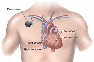 A pacemaker is a small device that regulates your heartbeat with electrical pulses. Pacemakers have two components called the “leads” and “pulse generator”. The pulse generator is placed just under your skin and has a battery and miniscule computer. The leads are inserted into your veins and heart muscle.